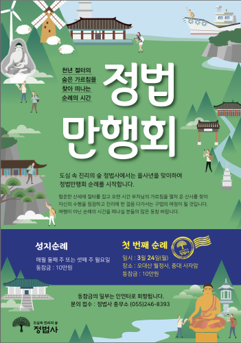 1. 관음재일 (인등기도 축원)- 일 시 : 2월 21일(금) 오전 10시- 장 소 : 원통보전2. 초하루법회·신중기도·정법보시 축원- 입 재 : 2월 28일, 3월 1,2일(금,토,일)오전 9시 30분- 장 소 : 만불보전3. 도심 속 진리의 숲 정법사에서는을사년을 맞이하여 춘계 방생을 대신하여보궁 순례를 합니다.신라 자장율사께서 중국에서 모셔 온 부처님 진신사리를 봉안한 5대 적멸보궁 가운데 한 곳인우리나라 최고의 성지인 오대산 중대 사자암,상원사, 월정사를 참배합니다.- 일 시 : 3월 24일(월)- 출발시간 : 오전 6시(예정)- 동 참 금 : 10만 원- 문의) 정법사 종무소 055. 246. 8393* 불자님의 많은 동참 바랍니다.