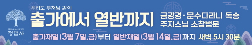 1. 초하루법회·신중기도·정법보시 축원주지스님 초하루 법문 함께합니다.- 입 재 : 2월 28일, 3월 1, 2일(금,토,일)오전 9시 30분- 장 소 : 만불보전2. 다라니기도 안내- 일 시 : 3월 1, 2, 3일(토,일,월) 저녁 8시- 장 소 : 만불보전3. 부처님 출가재일을 맞이하여'출가에서 열반까지'금강경과문수다라니 독송기도를 봉행합니다.주지스님의 소참 법문과 함께하는독송기도에 불자님의 많은 동참 바랍니다.- 일 시 : 3월 7일(금)부터 3월 14일(금)새벽 5시 30분- 장 소 : 만불보전4. 원통보전 33관음응신 33일 49차기도- 일 시 : 3월 12일(수) ~ 4월 13일(일)오후 2시- 접수 마감 : 3월 12일(수)- 장 소 : 원통보전* 불자님의 많은 동참 바랍니다.