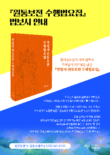 1. 초하루법회·신중기도·정법보시 축원- 입 재 : 1월 19, 20, 21일(월, 화, 수)오전 9시 30분- 장 소 : 만불보전2. 성도재일 철야정진 안내입니다.정법사에서는 오는 성도재일을 맞이하여법화경 전품을 수지 독송하는기도 수행정진을 봉행합니다.- 일 시 : 1월 25일(일) 저녁 8시부터1월 26일(월) 새벽 4시까지- 1일초 1인 동참 1만원입니다.(문의 : 정법불교사 055.241.2683)- 장 소 : 만불보전3. 『원통보전 수행법요집』 법보시 안내정법사 원통보전에 관세음보살의 자비 원력과부처님의 가르침을 담은『원통보전 수행법요집』을 법공양 올립니다.- 동참금 : 1인 5만원(문의 : 종무소 055.246.8393)* 불자님의 많은 동참 바랍니다.
