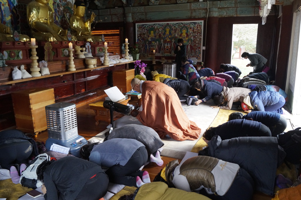 백련사 대웅보전에서 보현 스님과 함께하는 사시마지 예불 동참 모습